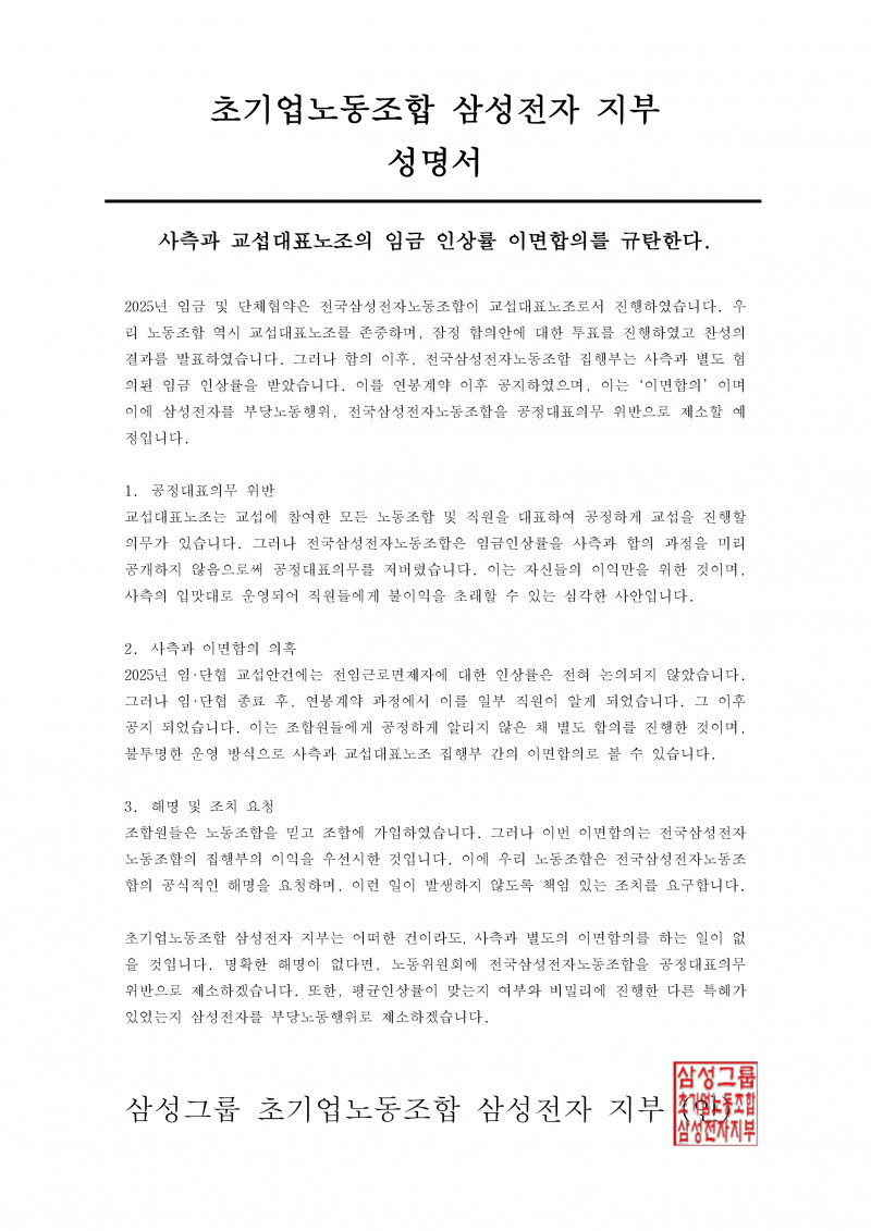 초기업노동조합 삼성전자 지부의 입장입니다.