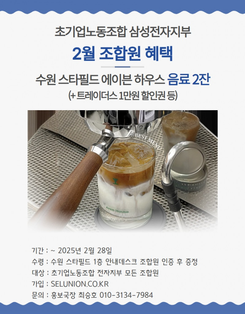 이번 달 조합원 혜택으로 수원 스타필드 방문시 입점 매장의 음료 2잔 쿠폰(약1만원이상)등을 받으실 수있습니다.