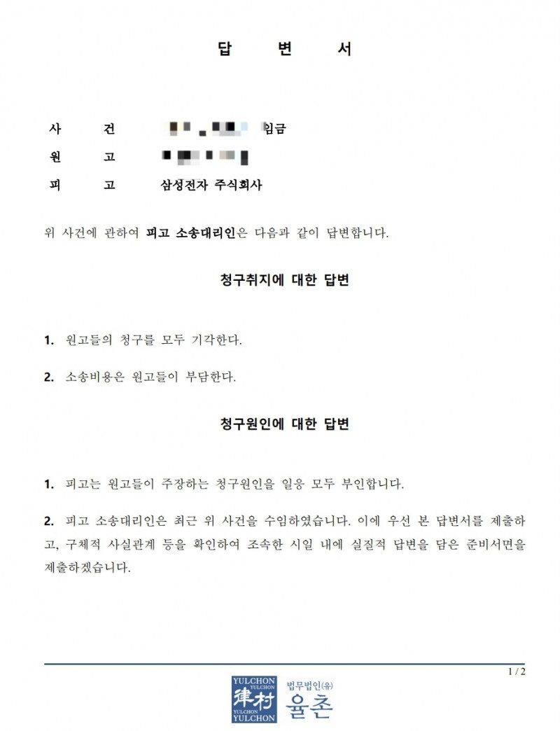 통상임금 2차 소송 진행중이며 삼성전자의 답변서가 제출되었습니다.
