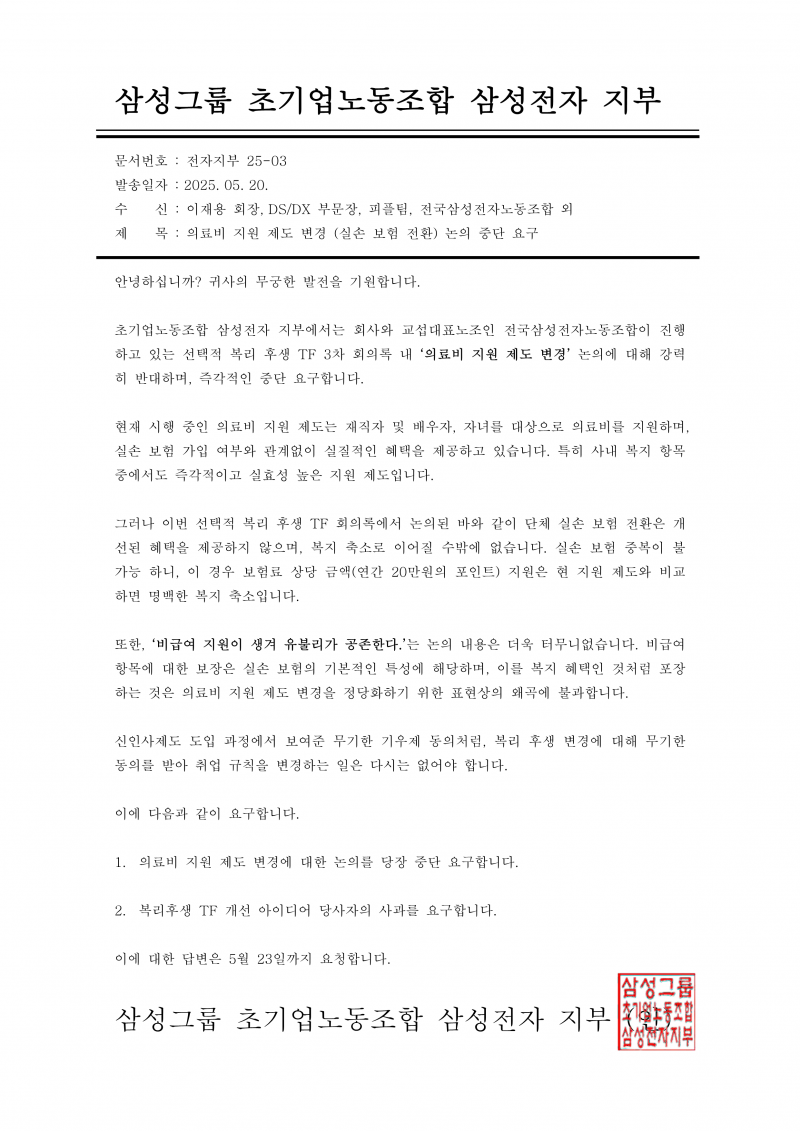 회사 및 전국삼성전자노동조합에 공문 발송하였습니다.